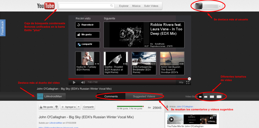 Hace unos días YouTube lanzó una nueva interfaz, llamada Cosmic Panda, la cual destaca un color obscuro alrededor del video, a diferencia del color blanco de fondo, el cual permite que el usuario pueda disfrutar mejor del video. Más detalles en las siguientes imágenes: