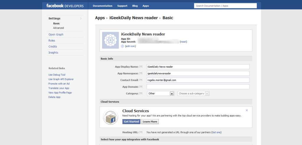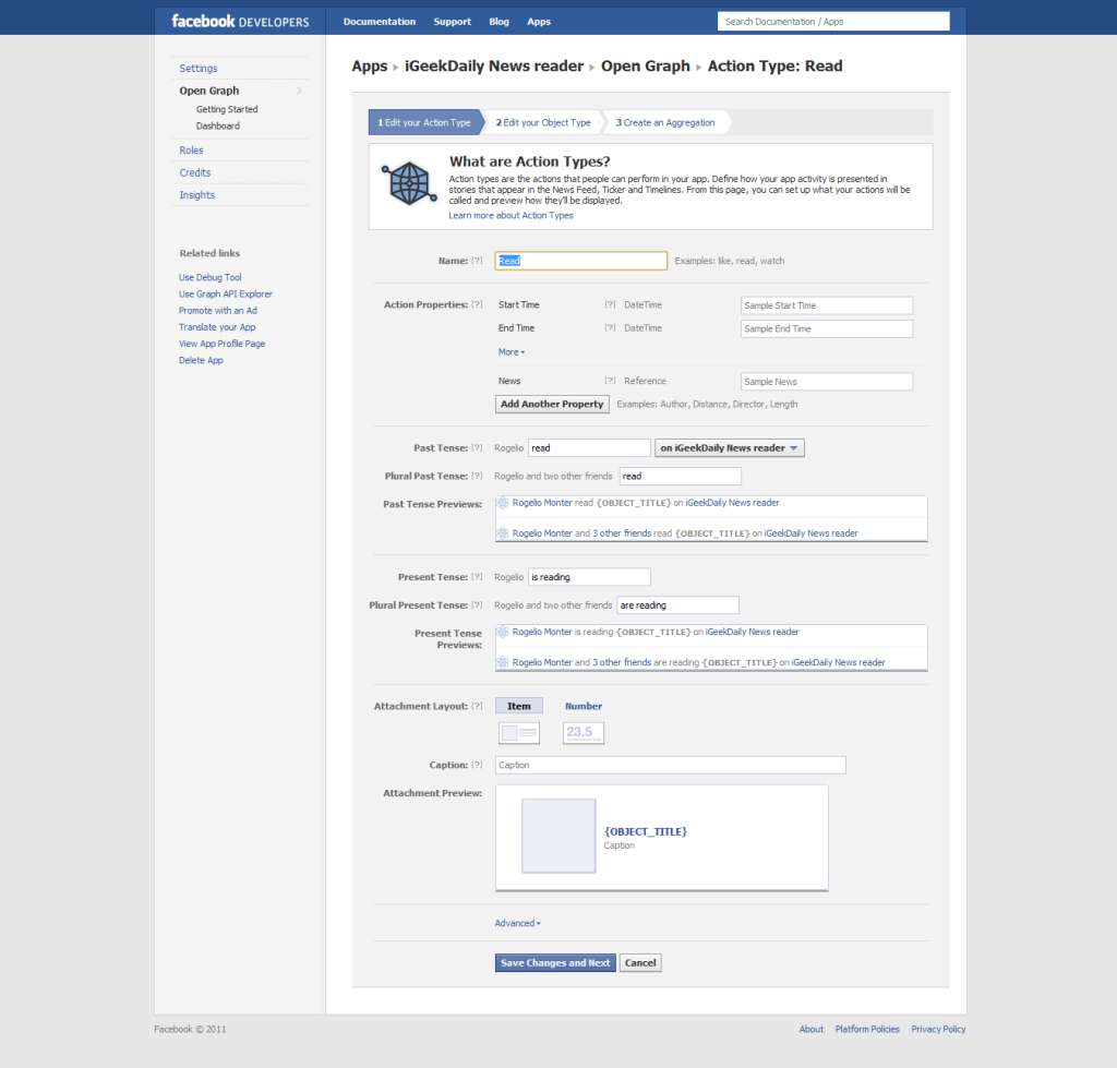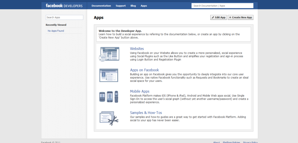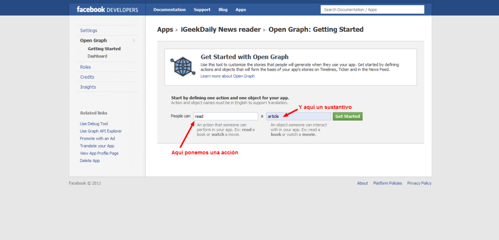 Como dige en el parrafo anterior, timeline solo está disponible para desarrolladores, así que tendremos que hacerle creer a Facebook que somos desarrolladores. Para ello, crearemos una app en Facebook con Open Graph.